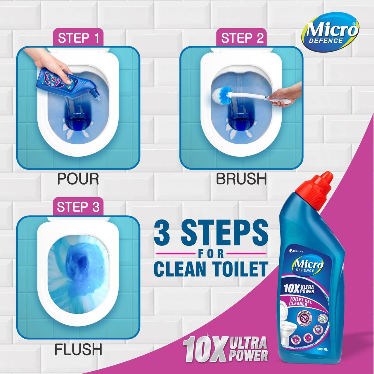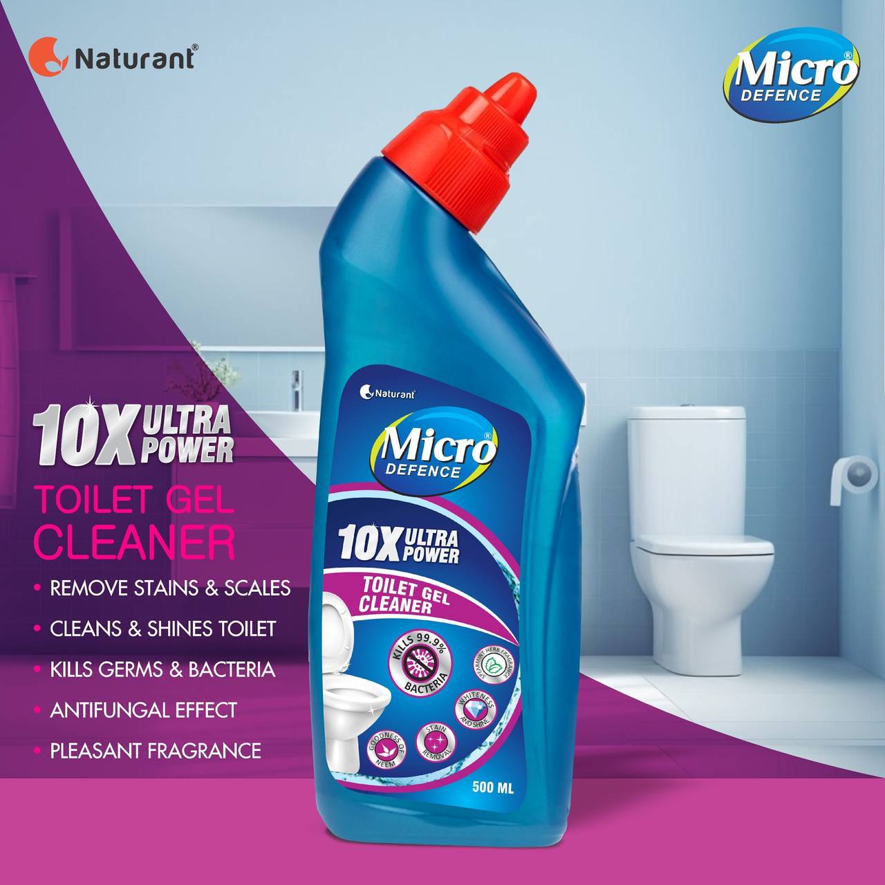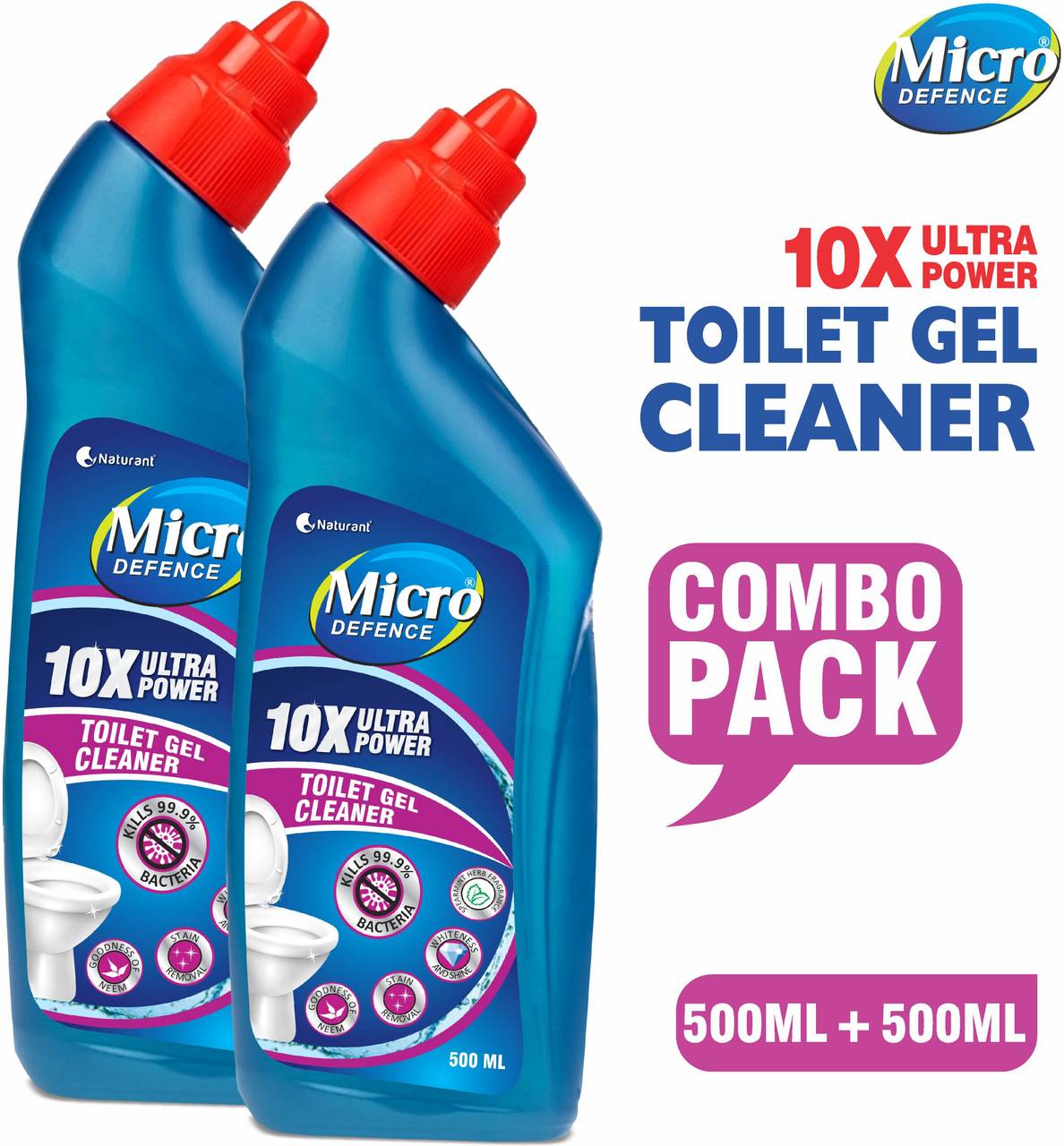 Introducing MicroDefence Toilet Cleaner Gel with 10X Ultra Power for unparalleled toilet hygiene. Boasting a 99.9% germ-killing potency and advanced descaling technology, this cleaner eradicates lime scales, urine marks, and heavy soil, ensuring a spotless toilet bowl. The 10X concentrated formula offers maximum cleaning with minimal product, while corrosion inhibitors safeguard Western and Indian toilet seats. Its extra-thick, septic tank-safe gel clings to bowl walls, allowing for thorough scrubbing. Enjoy a pleasant fragrance without harsh fumes, and experience superior stain removal for consistently clean results. Elevate your bathroom experience with MicroDefence—the ultimate solution for a hygienic and fresh toilet bowl.