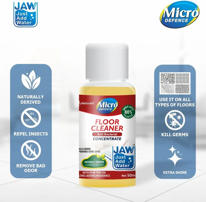 A powerful Cost – saving daily floor cleaner for perfect cleaning & sanitizing needs. The naturally derived cleaning actives effectively removes dirt & grime. Use it to clean floors made of ceramic, marble, granite & remove bad odor from the toilets. Highly concentrated formula to be used after dilution which makes it economical to use.The pine oil effectively kills bacteria and leaves the surfaces shining all day.Gentle on hands with zero harsh chemicals like bleach.Vegan, family safe & Cruelty free.Proudly formulated using Indiaās first Just Add Water Technology. Saves 80% Plastic, water, storage space, fuel & promote carbon reduction with Micro Defence range of products. Use it daily & alternatively in combination with Floor Cleaner Pine oil, Lemon oil and Neem oil for overall protection against anti-microbial resistant germs & bacteria.