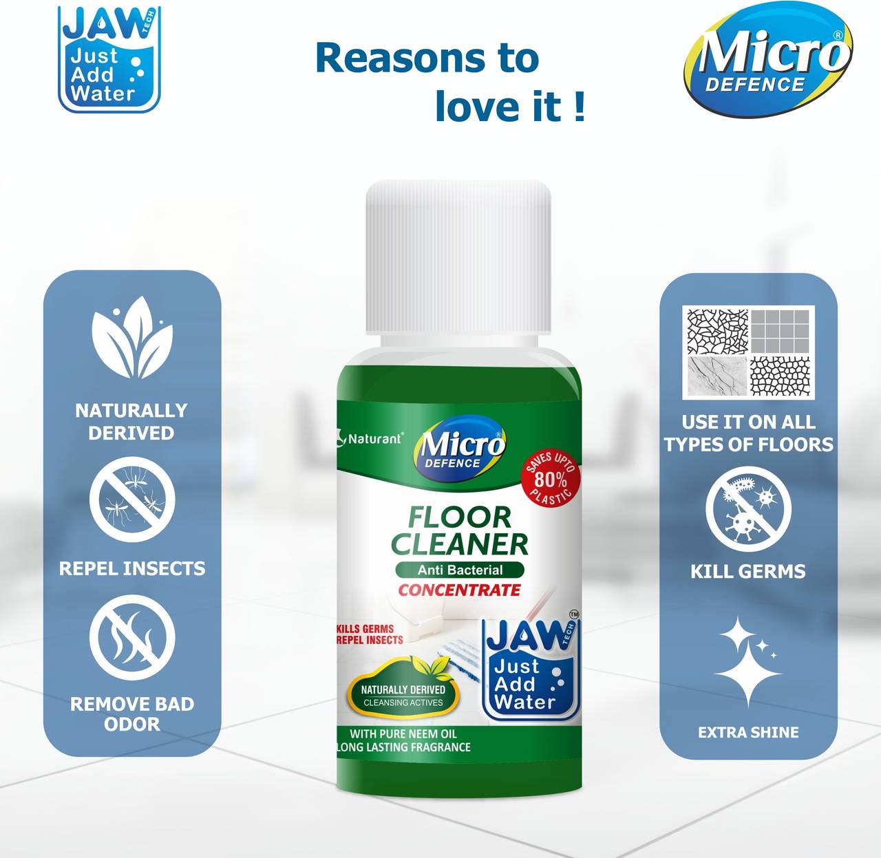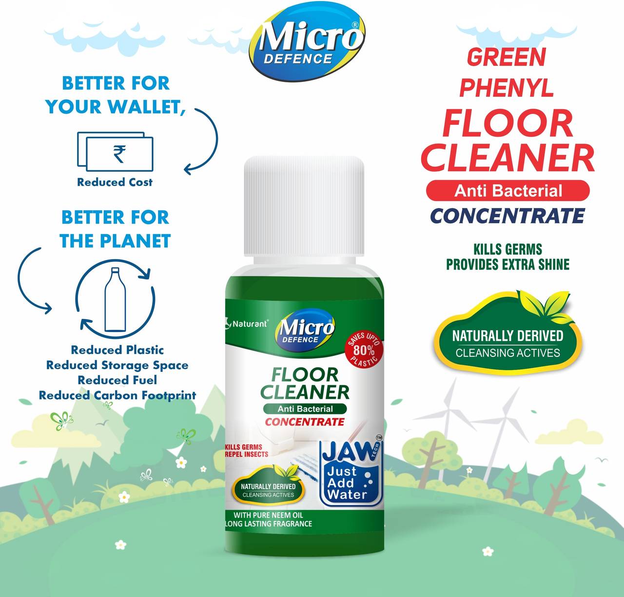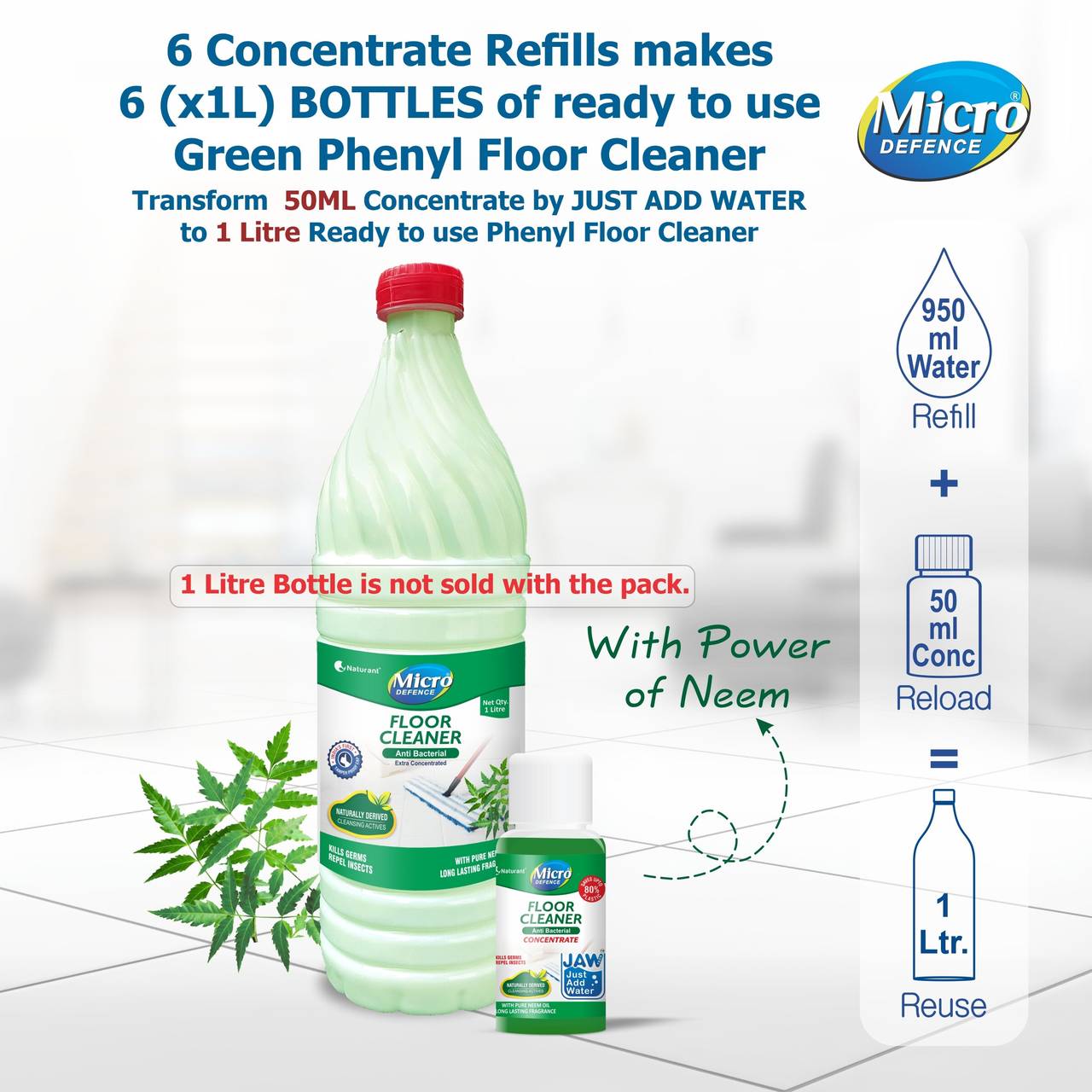 ā¢Introducing MicroDefence floor cleaner, expertly crafted from the power of pine oil that effortlessly transforms into a refreshing pine oil based white phenyl when water is added to it. ā¢The innovative all natural formula is pet & child friendly & effectively cleans, protects, and refreshes all kinds of floors such as , wood, stone, tiles, granites, marbles, yet gentle on hands. ā¢In addition to its eco-friendly nature, MicroDefence pine oil-based floor cleaner acts as a natural repellent, keeping pesky mosquitoes, house flies, and ants at bay. With every use, it leaves your floors sparkling clean, while imparting a delightful and pleasant aroma. ā¢Discover the unmatched power of MicroDefence pine oil, neem oil and lemon oil floor cleaners today. ā¢Use it daily & alternatively in combination with Floor Cleaner Pine oil, Lemon oil and Neem oil for overall protection against anti-microbial resistant germs & bacteria from your home. ā¢By utilizing just 50 ml of our concentrated solution, you can create liter of ready-to-use phenyl based floor cleaner, effectively reducing plastic waste associated with traditional cleaning products.