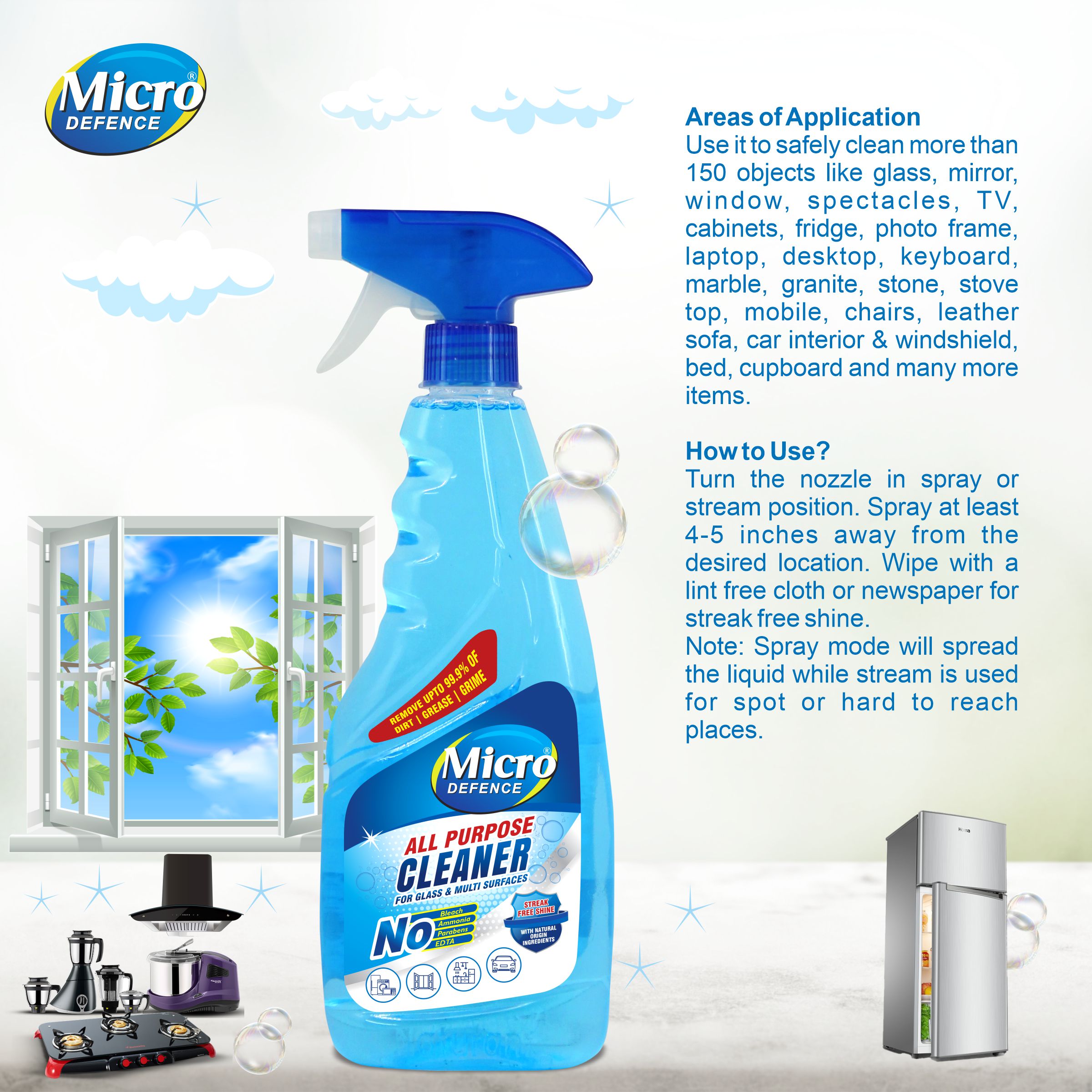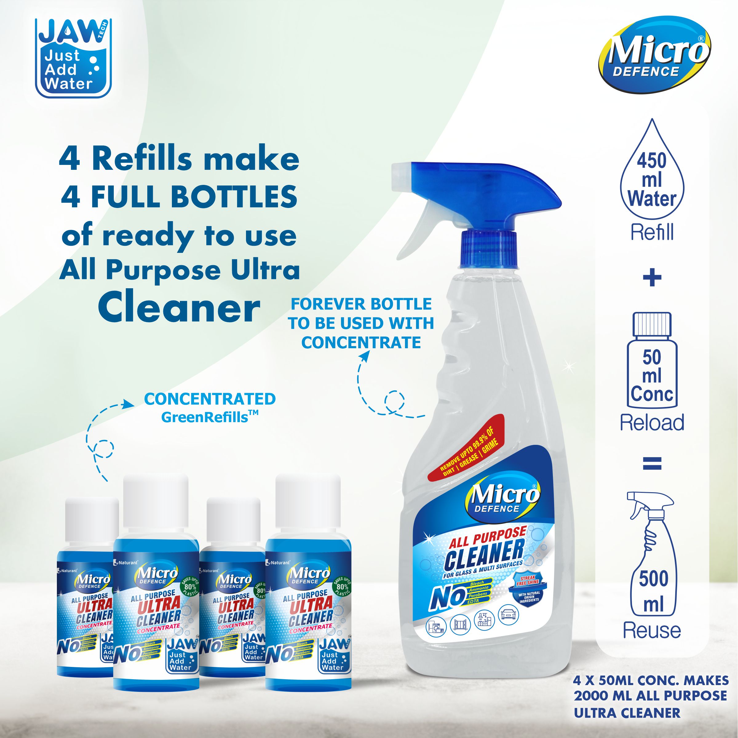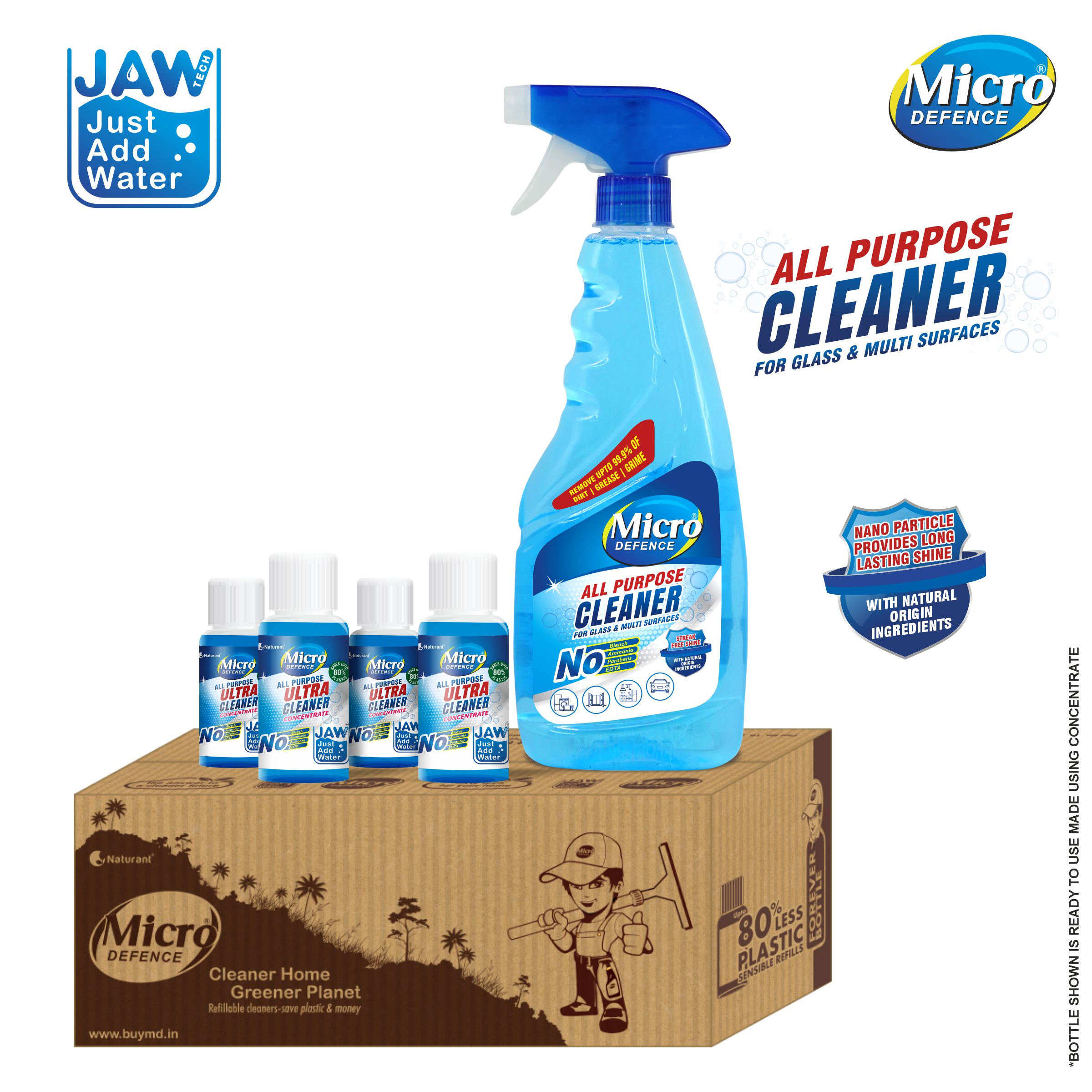 ā¢Introducing MicroDefence All Purpose Ultra Cleaner formulated with safety and effectiveness in mind. ā¢This powerful cleaner is designed to work on over 150 objects and surfaces found within your home, kitchen, bathroom, and living room. From countertops to floors, walls to appliances, glass to mirrors, and even your TV and tiles, this cleaner has got you covered. ā¢With a powerful plant based formula that removes up to 99.9% of dirt, grime, and stains, this eco-friendly cleaner is made with biodegradable ingredients and contains no chlorine, ammonia, EDTA, or parabens. Infused with Nano particles, it forms a dirt-repelling layer for streak-free and stripe-free shine that will leave your surfaces looking brand new. ā¢It also comes with an energizing fragrance that eliminates & reduces bad odor. Simply spray and wipe for an effective clean against kitchen spills, bathroom residue, fingerprints, and general dirt buildup. ā¢This all-purpose cleaner also comes with disinfection and sanitization properties, making it perfect for high-touch areas. ā¢Eliminate the need for multiple cleaners with versatile MicroDefence All Purpose Ultra Cleaner and save time, money and effort in switching cleaners. ā¢It comes with JUST ADD WATER TECH that transforms to 500 ML from just 50 ML when water is added to it, making it a sustainable choice. ā¢Save 80% plastic, water, storage space, fuel, and promote carbon reduction with MicroDefence All Purpose Ultra Cleaner and enjoy a professional, high-quality clean that’s safe, effective, and eco-friendly.