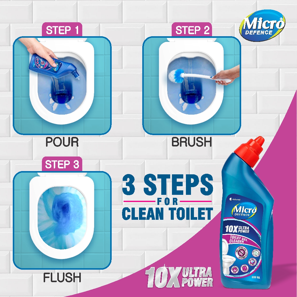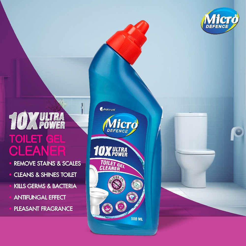 Introducing MicroDefence Toilet Cleaner Gel with 10X Ultra Power for unparalleled toilet hygiene. Boasting a 99.9% germ-killing potency and advanced descaling technology, this cleaner eradicates lime scales, urine marks, and heavy soil, ensuring a spotless toilet bowl. The 10X concentrated formula offers maximum cleaning with minimal product, while corrosion inhibitors safeguard Western and Indian toilet seats. Its extra-thick, septic tank-safe gel clings to bowl walls, allowing for thorough scrubbing. Enjoy a pleasant fragrance without harsh fumes, and experience superior stain removal for consistently clean results. Elevate your bathroom experience with MicroDefenceāthe ultimate solution for a hygienic and fresh toilet bowl.